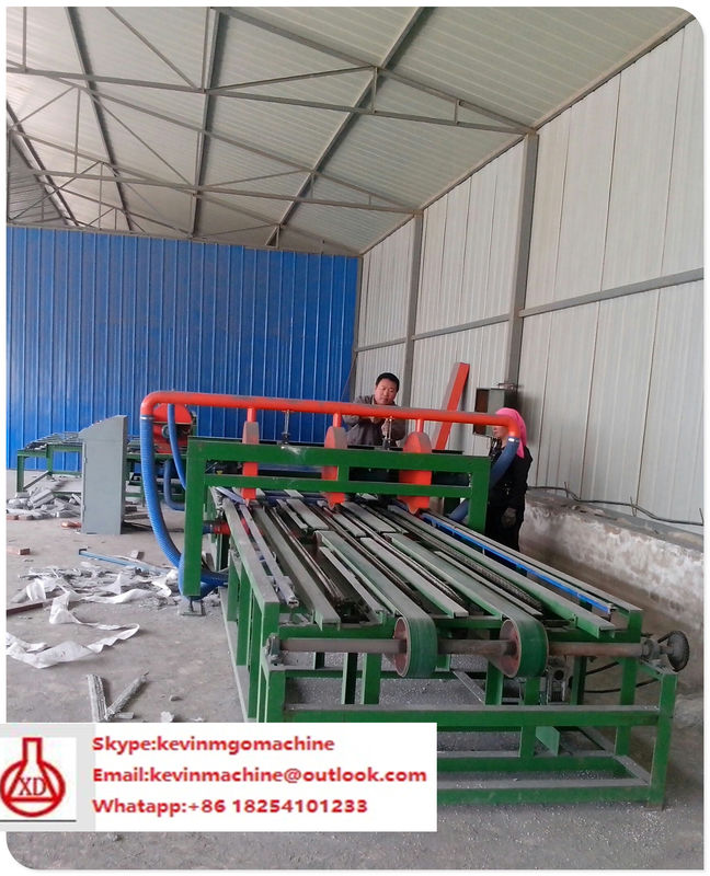 বোর্ডগুলি সুস্থ হয়ে গেলে সেগুলি রক্ষণাবেক্ষণ/কিউরিং রুম থেকে সরিয়ে দেওয়া হয় এবং পিভিসি প্যানেলগুলি থেকে আলাদা করা হয় যা বোর্ড প্রক্রিয়াকরণ লাইনের সামনে ফিরে আসে। নিরাময় করা বোর্ডের গোলাকার প্রান্ত এবং তারপর বোর্ডের চূড়ান্ত মাত্রা সম্পূর্ণ করার জন্য বর্গাকার ছাঁটা। ঐচ্ছিকভাবে, বোর্ডের বাজারের প্রয়োগের উপর নির্ভর করে এগুলিকে একদিকে মসৃণ ফিনিশের জন্য একটি শিল্প প্রশস্ত বেল্ট স্যান্ডারের মাধ্যমে প্রক্রিয়া করা হয়। ট্রিমিংগুলিকে পাল্ভারাইজ করা হয় এবং কাটা এবং স্যান্ডিং থেকে সমস্ত ধুলো দিয়ে সংগ্রহ করা হয় এবং পুনর্ব্যবহার করার জন্য মিক্সিং এবং ব্যাচিং প্ল্যাটফর্মে ফিরে আসে। দুটি প্রান্ত কাটিয়া মেশিন বোর্ড ছাঁটা ব্যবহার করা হবে. প্রয়োজনীয় কর্মশালার স্থান হল 1,100 বর্গফুট।